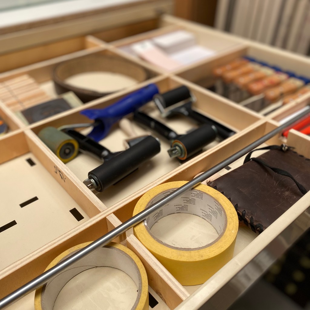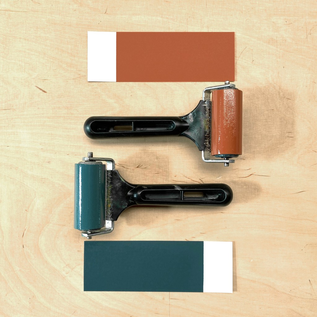 Für das Auftragen der Durckfarbe nutze Ich verschiedene Hartgummiwalzen (Firma Artway und Boesner), für die Bearbeitung des Linoleums (Linolschnitt), sowie für die Bearbeitung von Holz (Holzschnitt), unterschiedliche Messer (Firma Kirschen und Boesner) und Werkzeuge zur Holzbearbeitung, wie Stechbeitel oder ähnliches.