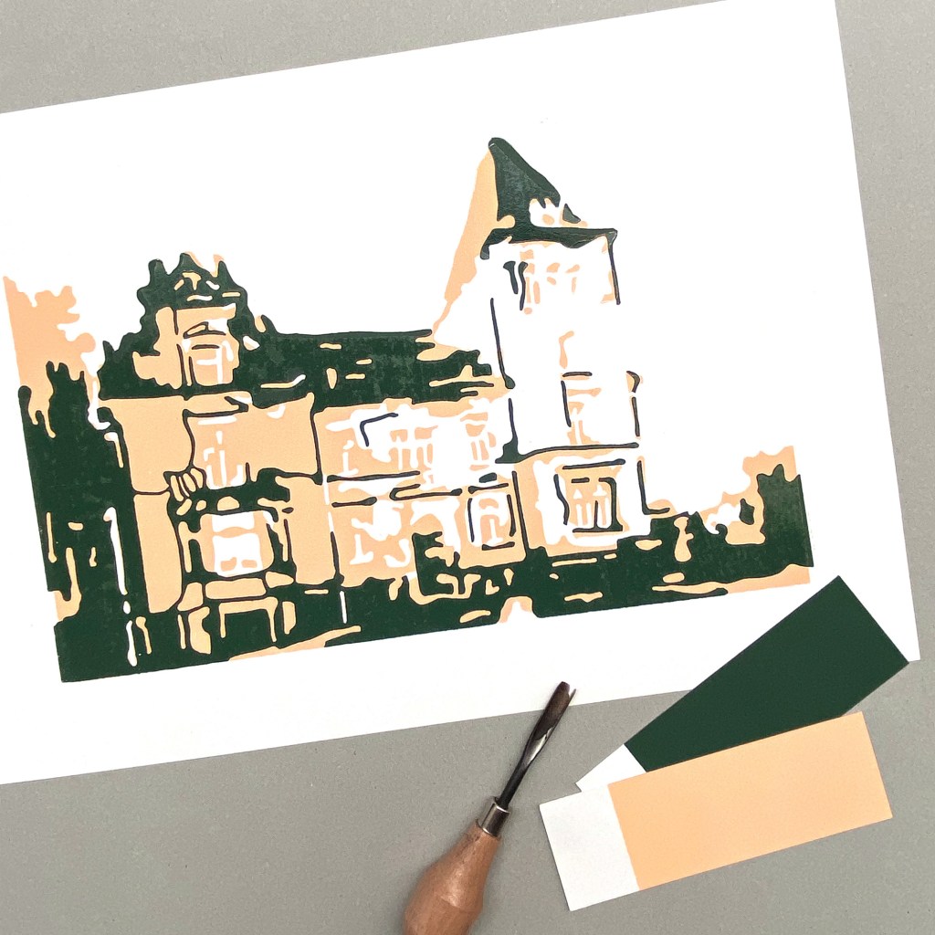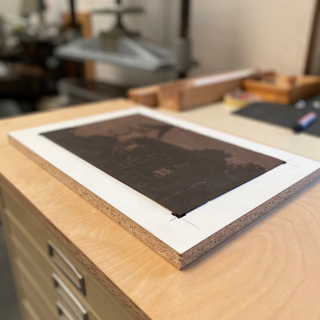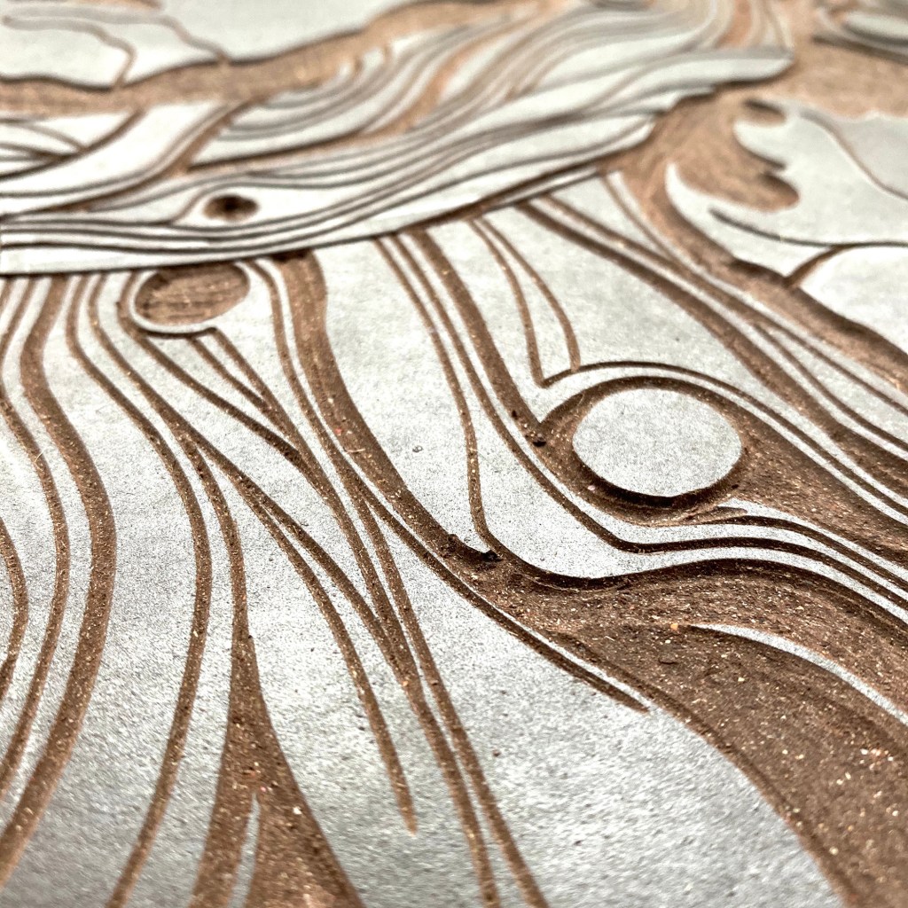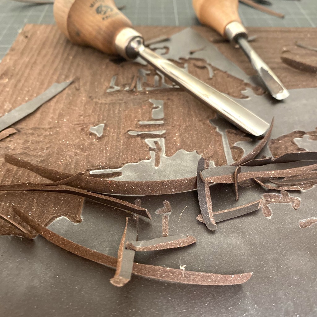 der Geflor DLW GmbH (ehemalig Deutsche Linoleum-Werke AG). Dieses Material lässt sich hervorragend schneiden und nimmt zudem die Ölfarbe perfekt an. Bei harten oder älteren Linoleum, kann der Schneideprozess vereinfacht werden, indem das Material erwärmt und dadurch wieder geschmeidig gemacht wird. Nach dem Druckprozess, reinige ich das Linoleum mit Terpentin-Ersatz (alternativ kann auch Isopropanol, Reinigungsalkohol oder ähnliches für die Reinigung verwendet werden).