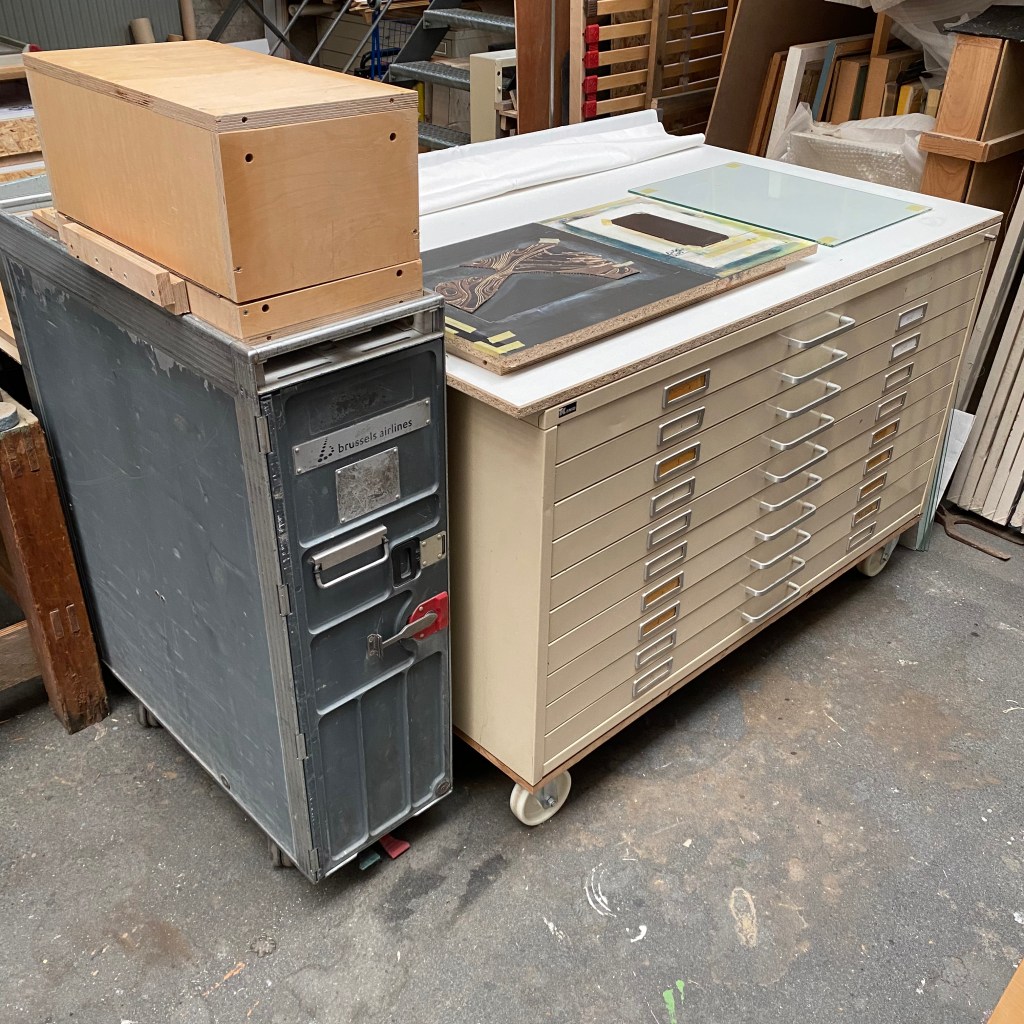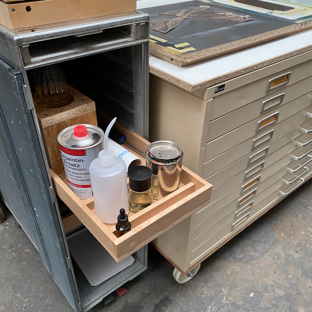 Zur Aufbewahrung von Ölen, Terpentin zur Reinigung der Linolplatten, Walzen und weiterem Zubehör haben Ich einen alten Airline Trolley zweckentfremdet und für meine Bedürfnisse umgebaut.