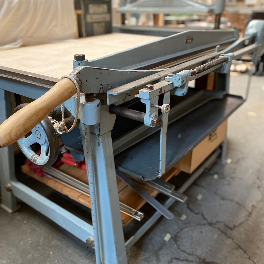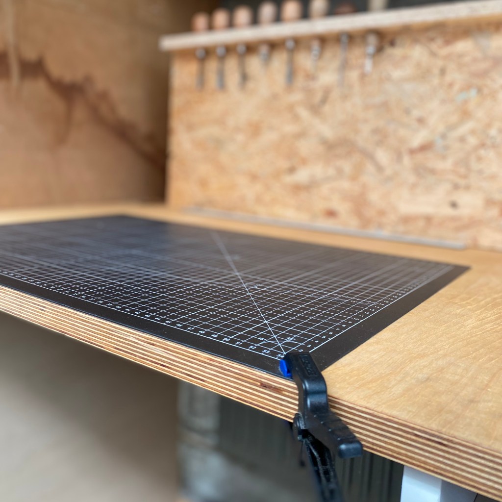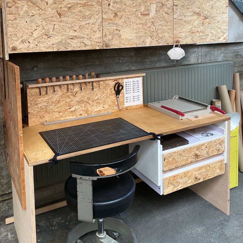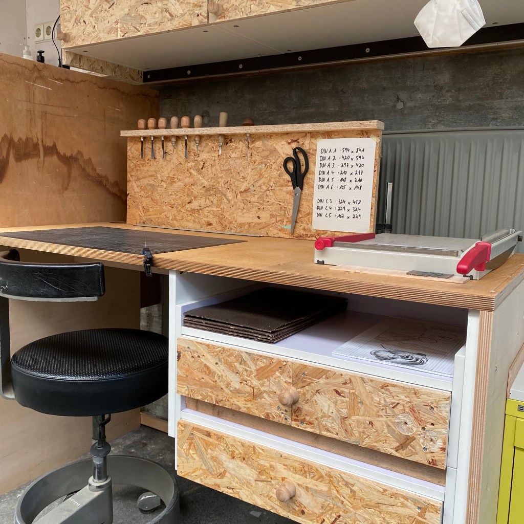 Der neue Arbeitsbereich für das Schneiden und Vorbereiten der Linoleumplatten ist zum größten Teil aus alten Holzplatten, aussortierten Schrankbauteilen mit kaputten Schubladenauszügen und Griffen, sowie andere Dingen die seit Jahren im „Materiallager“ auf einen neuen Einsatzzweck warten mussten, entstanden.