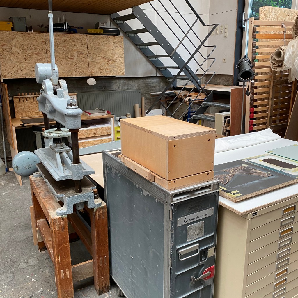 Geplant und gebaut Anfang der 1990er Jahre, diente die untere ca. 80 Quadratmeter große Ebene des Ateliergebäudes, zunächst ausschließlich der Malerei auf Leinwand. Im Laufe der Jahre wurden immer mehr Arbeitsbereiche, hauptsächlich für Holzbearbeitung und Prototypenbau (Möbelbau), hinzugefügt. Neben Malerei und Werkstatt zur Holzbearbeitung, habe Ich 2021 meinen neuen Bereich für Drucktechnik mit verschiedenen Stationen eingerichtet.